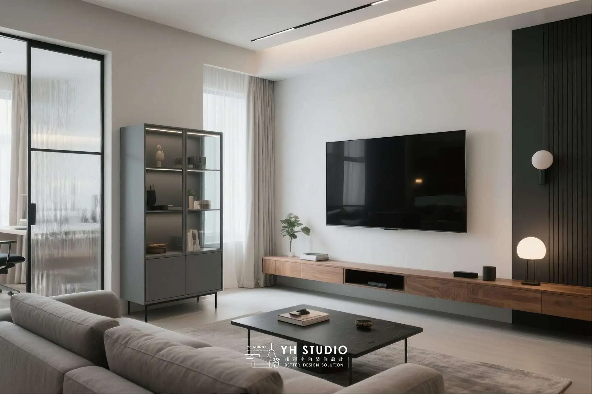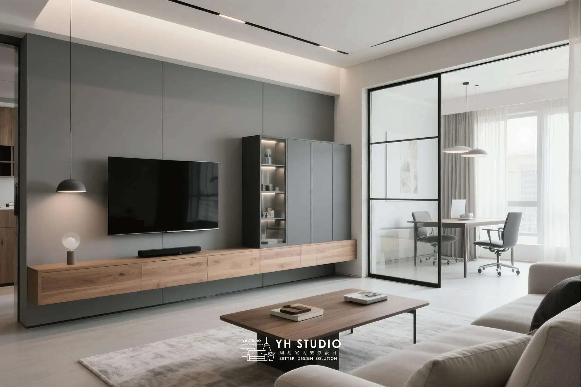 動線清晰:從電視牆、展示櫃、茶几、沙發,一路延伸至起居室,每個區域都井然有序,生活使用更直覺。