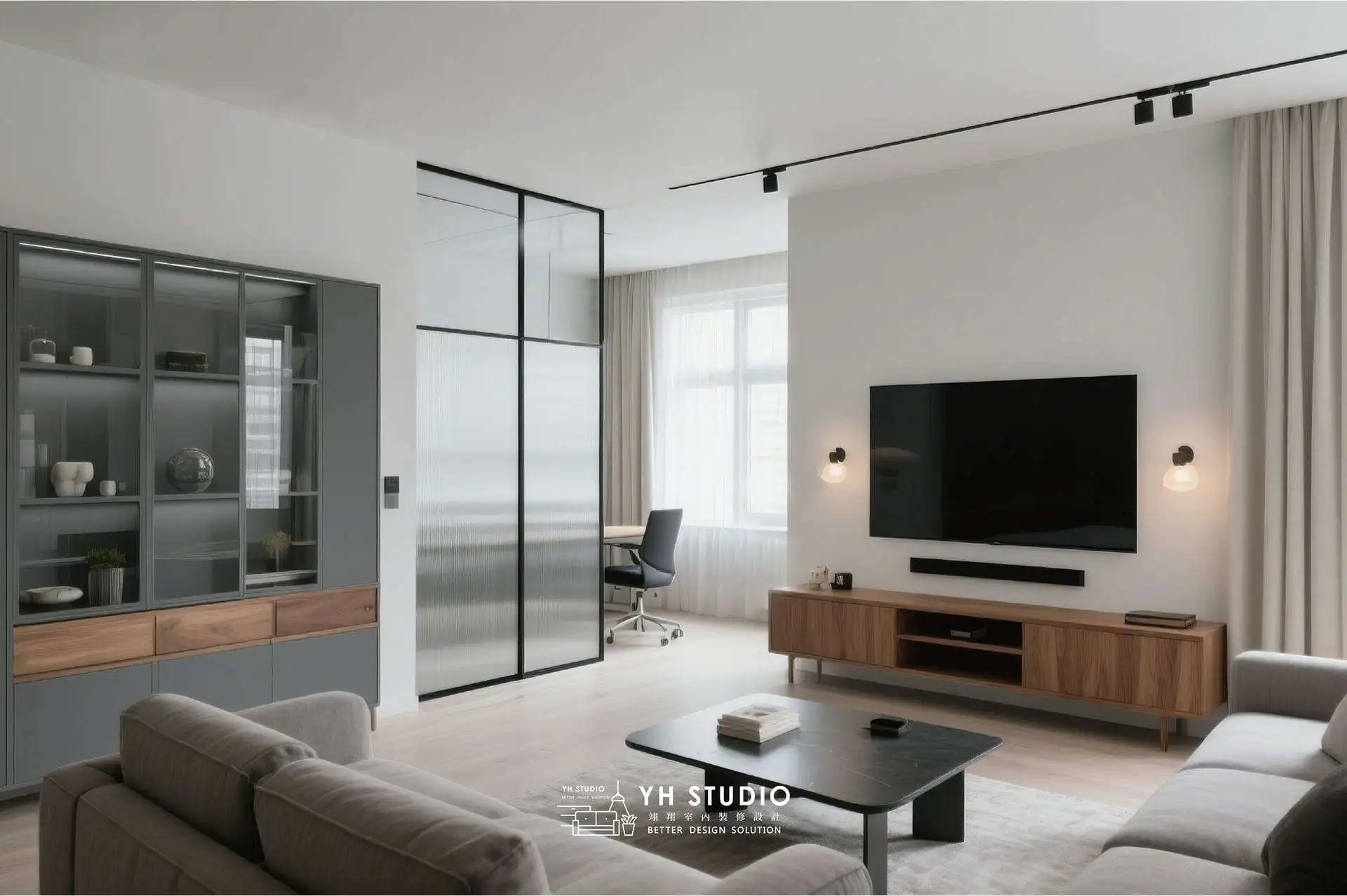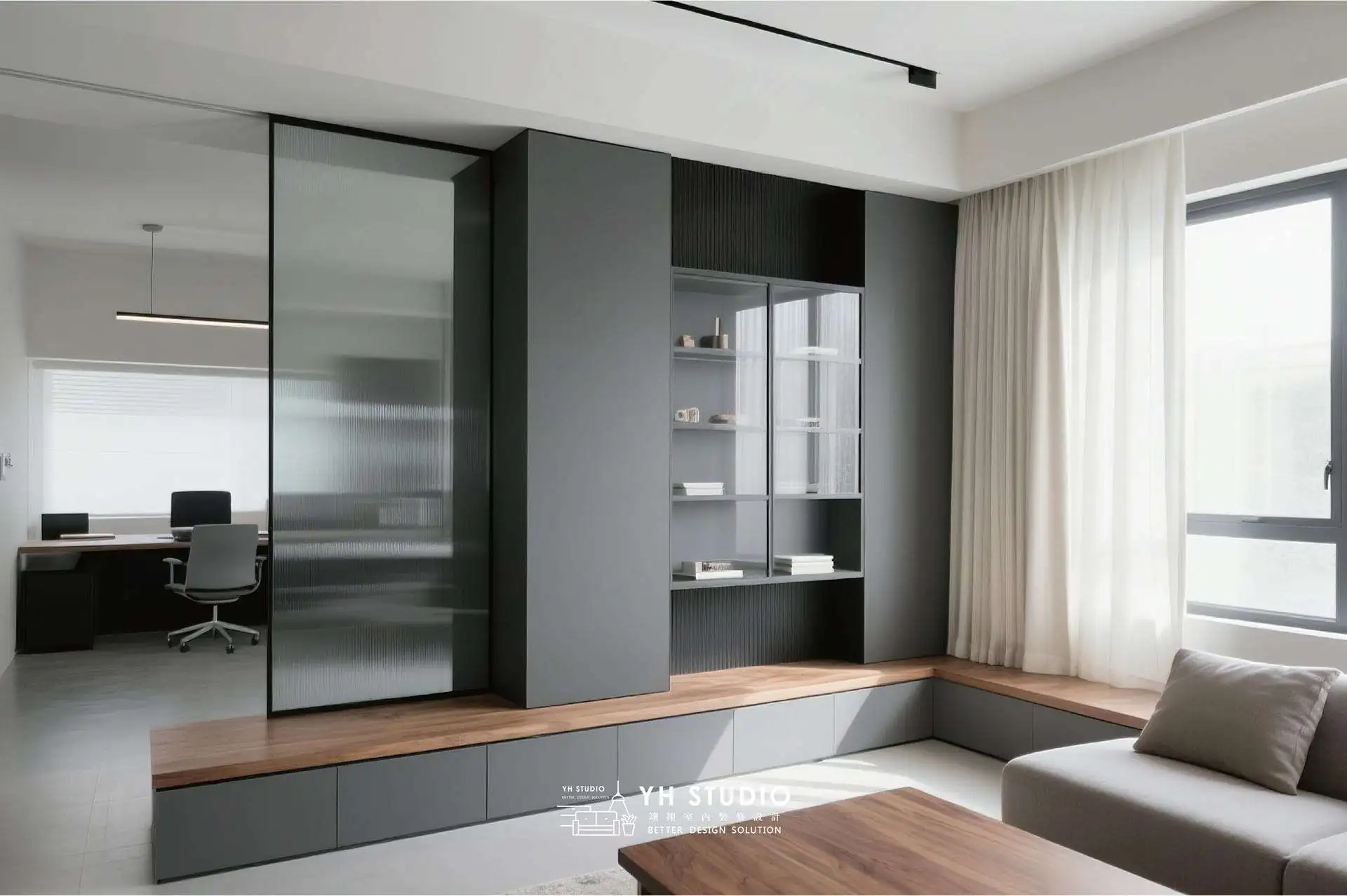 天花板結合間接照明、軌道燈與造型燈飾,營造層次光影,讓視覺與機能同時兼顧。;起居室,更是辦公交流與放鬆時刻的重要角落,在動線規劃下,它成為生活中自然延伸部分。